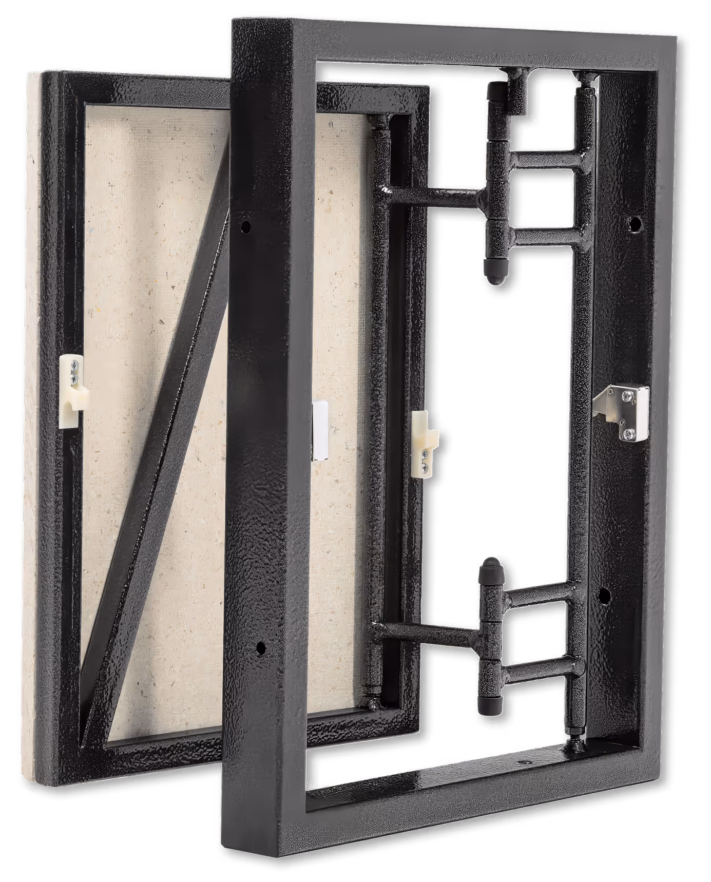 Виріб виготовляється з міцної конструкційної сталі високої якості. Зварні шви виконані за міжнародним стандартом. Виріб покривається порошковою фарбою, що забезпечує високу антикорозійну стійкість. На дверцята люка прикріплена ГВЛВ плита. Виріб комплектується високоякісною фурнітурою та метизами.